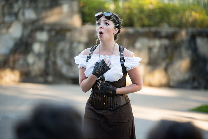 The Tempest was ETP's second pay-what-you-will production that married steampunk and magic with Shakespeare's final play. We retained the services of magical conjurer D.R. Schreiber, who helped actor Bill Bernsohn perform several magic tricks during the program. The giant steaming 8' teapot was constructed by acclaimed steampunk artist Charles Mason III.